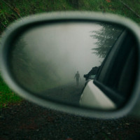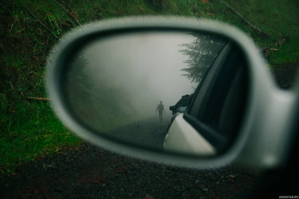 a foggy landscape. There is a person visible in the reflection of the mirror, but they are obscured by the fog, making it difficult to discern their