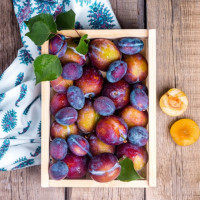 The image shows a basket filled with plums. These plums have