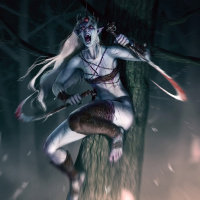 pointed ears resembling those of a vampire, along with what seems to be a fantasy or elf-like attire, including a bow. The setting appears to be