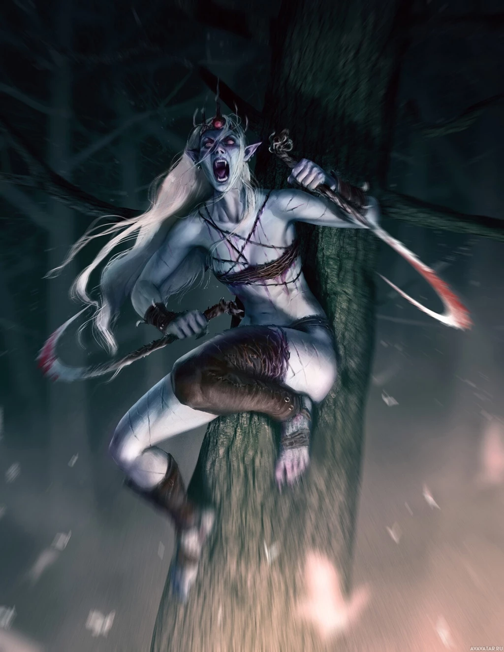 The image depicts a fantasy-themed scene. There is an individual who appears to be in a frenzied or aggressive state, with their arms raised and mouth open as if yelling or shouting. They are wearing a costume that includes