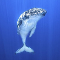 The image features a whale submerged in water. The whale appears to be a blue or gray shade, and there is a distinctive pattern on its body that could indicate it's a certain species of whale. The photo captures the whale in a way that showcases its size and shape within the aquatic environment.