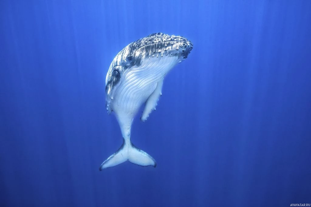 На картинке изображен кит, погруженный в воду. Кит кажется синим или серым оттенком, и на его теле есть отличительный рисунок, который может указывать на то, что это определенный вид кита. На фотографии кит запечатлен таким образом, что демонстрирует его размер и форму в водной среде.