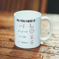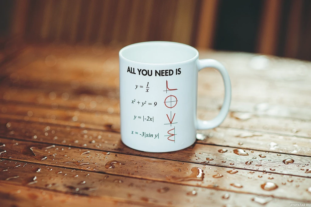 На картинке изображена белая кружка с напечатанным на ней текстом «Все, что вам нужно». Кружка помещается на деревянную поверхность, и на древесине есть капли воды, что говорит о том, что ее, возможно, недавно вымыли или вылили дождем. Фон не в фокусе, но, кажется, является внутренней обстановкой с теплым освещением.