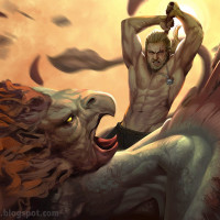a dynamic pose with one hand extended outward as if he's wielding a sword or a weapon. Next to him stands a creature that looks like a griffon,