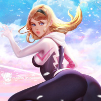 long hair and is wearing a costume that includes elements reminiscent of Spider-Woman's attire, with a spider emblem on her chest. The background suggests