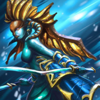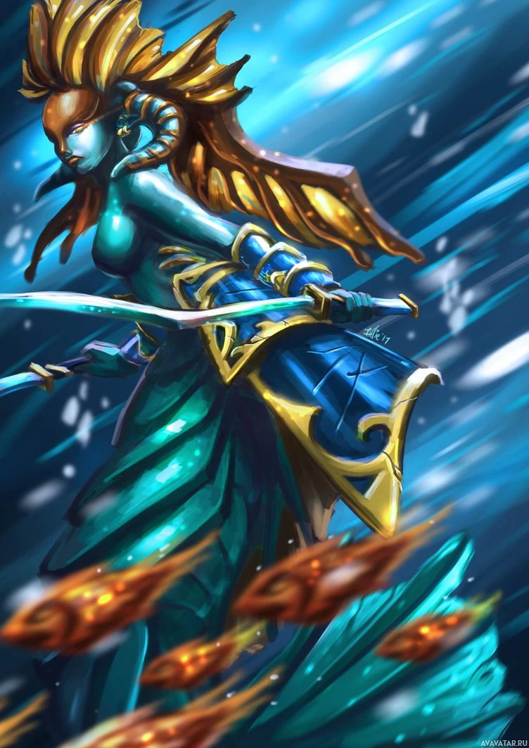 На картинке изображен анимированный персонаж, который выглядит как Сирена Нага из игры Dota 2. Персонаж изображен с водными чертами, включая плавники и чешуйки, и обладает мечом и щитом. Художественный стиль предполагает, что это может быть рекламная иллюстрация или фан-арт, вдохновленный дизайном персонажа в игре.