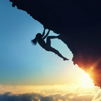 The image depicts a person climbing up the side of a rock face or cliff. It appears to be a sunrise or sunset due to the warm lighting, which adds a dramatic effect to the scene. The silhouette of the person is visible against the bright sky background, creating a strong contrast between the figure and its surroundings. The image captures the essence of mountaineering, showcasing both the physical challenge and the natural beauty of the environment.