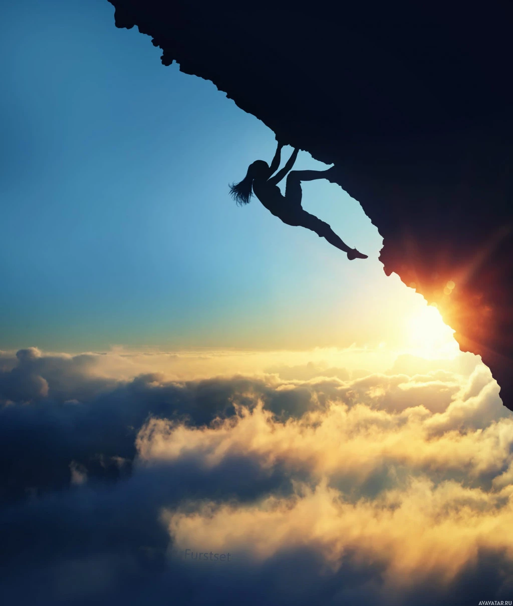 На картинке изображен человек, поднимающийся по склону скалы или скалы. Похоже, что это восход или закат солнца из-за теплого освещения, что добавляет драматический эффект сцене. Силуэт человека виден на ярком фоне неба, создавая сильный контраст между фигурой и ее окружением. Изображение отражает суть альпинизма, демонстрируя как физическую проблему, так и естественную красоту окружающей среды.