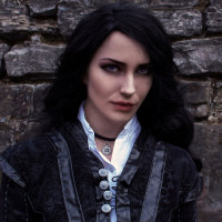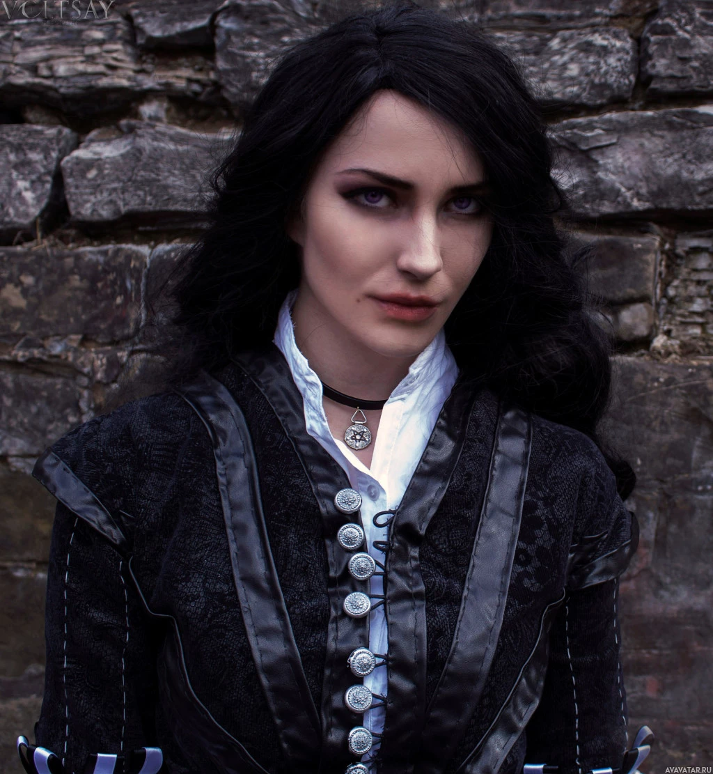 The image shows a person dressed in what appears to be a cosplay outfit inspired by Yennefer, a character from