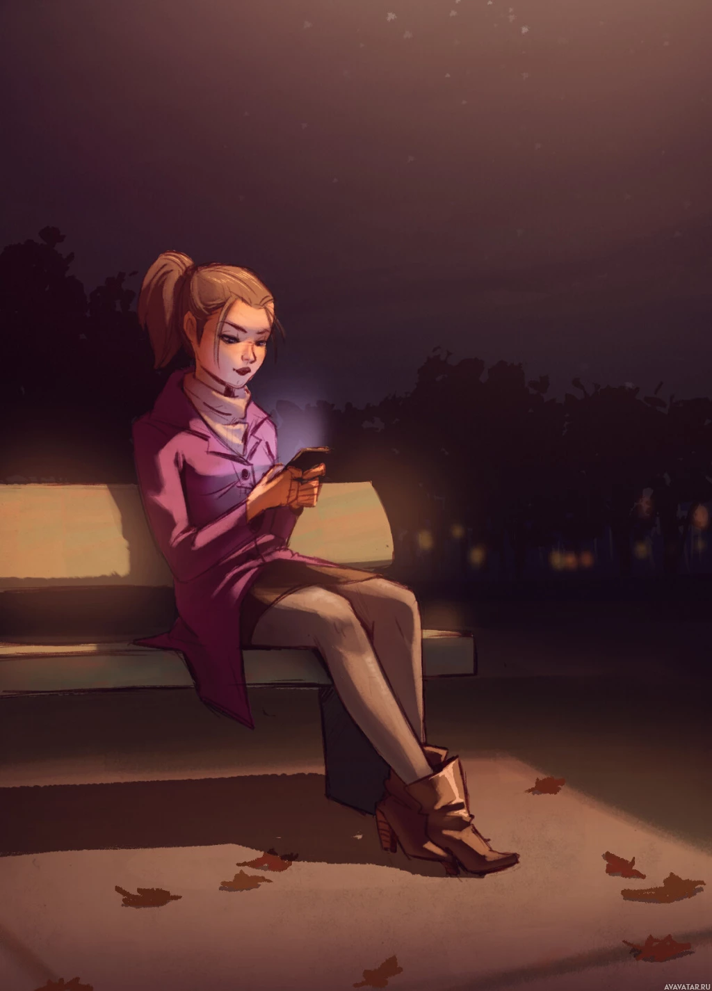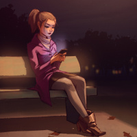 a bench at night. She is holding a phone in her hand and appears to be looking at it, possibly texting or browsing the internet. It's