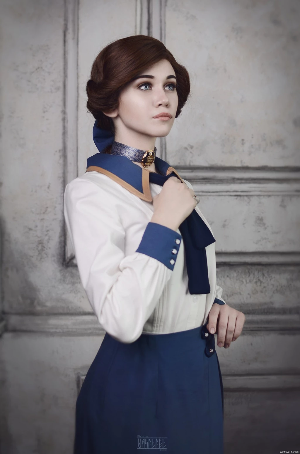 video game series. This costume is typically associated with steampunk and vintage themes, featuring a blend of blue, white, and dark colors with detailed embellishments that suggest a historical or alternative history setting. The individual is standing in what appears to be a studio setting with