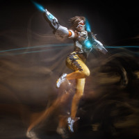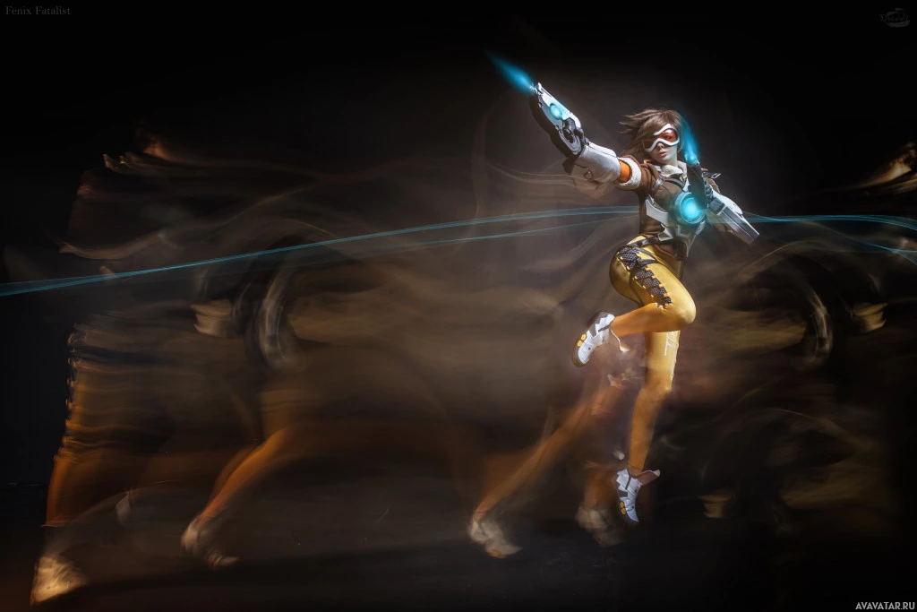 the video game Overwatch. This character is known as Tracer and is depicted in mid-action, running with her arms outstretched, emitting