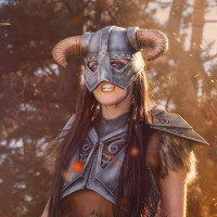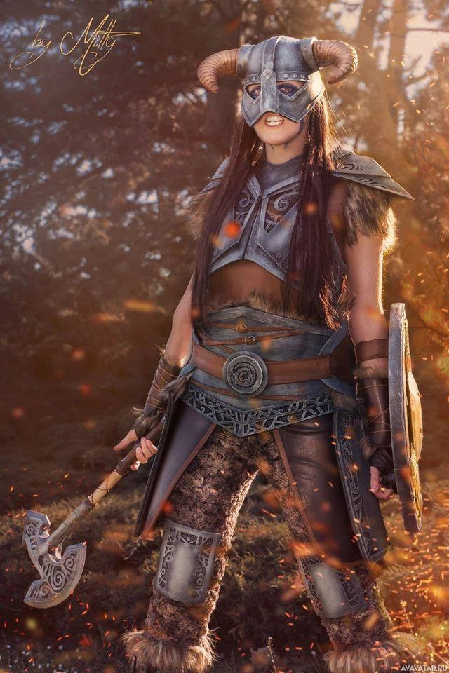 The image depicts a person dressed in armor and holding a shield, suggesting they are portraying a character from