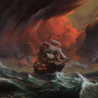 red hues, suggesting a stormy atmosphere. There are no visible people on the deck of the ship, which adds to