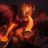 The image depicts a fantasy-style dragon character. It has wings and is surrounded by flames, which suggests it may be a representation of a powerful or fierce creature from mythology or fantasy literature/media. The art style is quite dynamic, with the flames adding to the intensity of the scene.