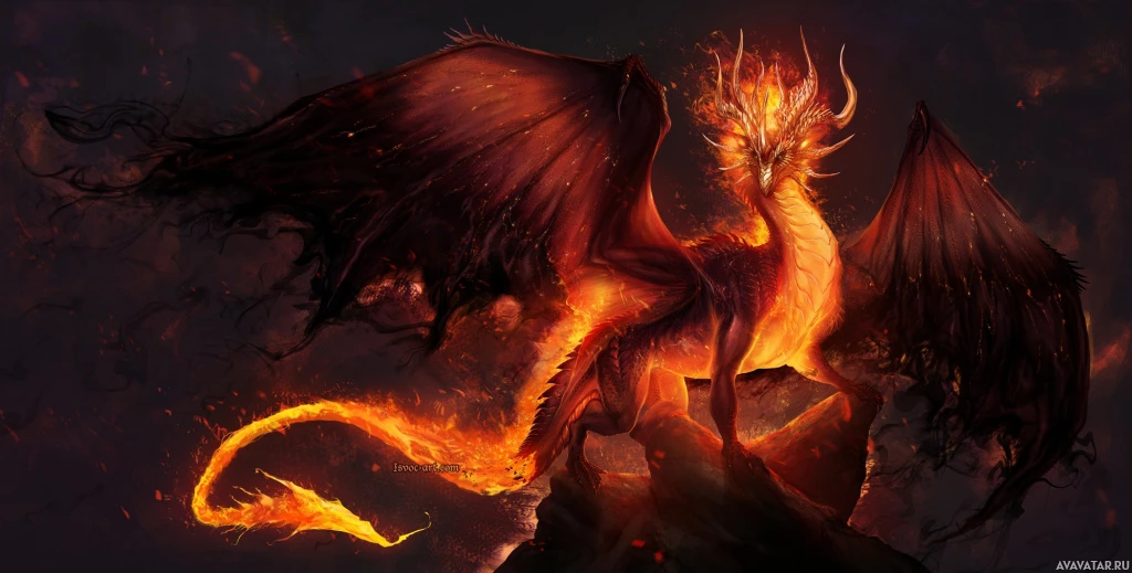 Картинка показывает дракона в стиле фэнтези. Он имеет крылья и окружен пламенем, что предполагает, что это может быть изображение мощного или жестокого существа из мифологии или фэнтезийной литературы / средств массовой информации. Художественный стиль довольно динамичен, а пламя усиливает интенсивность сцены.