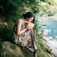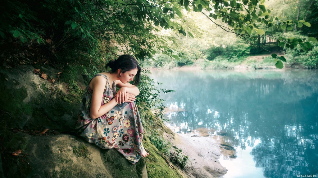 a thoughtful pose. The setting seems peaceful and natural, with greenery around her. The colors are soft and naturalistic, suggesting it might be either dawn or dusk due to