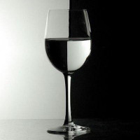 The image shows a glass of water placed on a reflective surface. The reflection is clear and mirrors the shape of the glass, creating an interesting visual effect.