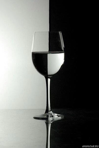 На картинке показан стакан воды, помещенный на отражающую поверхность. Отражение четкое и отражает форму стекла, создавая интересный визуальный эффект.