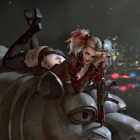 an urban environment at night, possibly indicative of the setting often associated with characters like Harley Quinn.