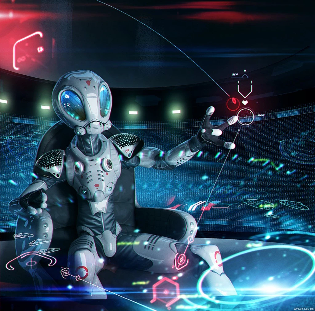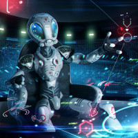 blue eyes, which adds to its humanoid appearance. Surrounding the robot are various technological interfaces and screens displaying data, suggesting that this is a high-tech environment where