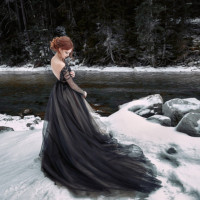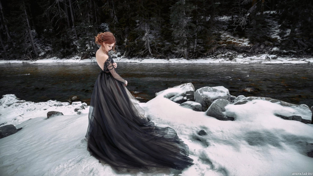 red hair, wearing a long black dress. She is standing on the snowy