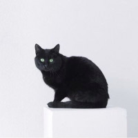 The image shows a black cat sitting on a white surface or platform. The cat has a calm and alert posture, looking directly at the camera with its bright green eyes. The background is plain and light-colored, which provides a stark contrast to the dark color of the cat.