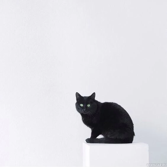 На картинке изображена черная кошка, сидящая на белой поверхности или платформе. Кошка имеет спокойную и настороженную осанку, глядя прямо в камеру своими ярко-зелеными глазами. Фон простой и светлого цвета, что обеспечивает резкий контраст с темным цветом кошки.