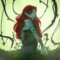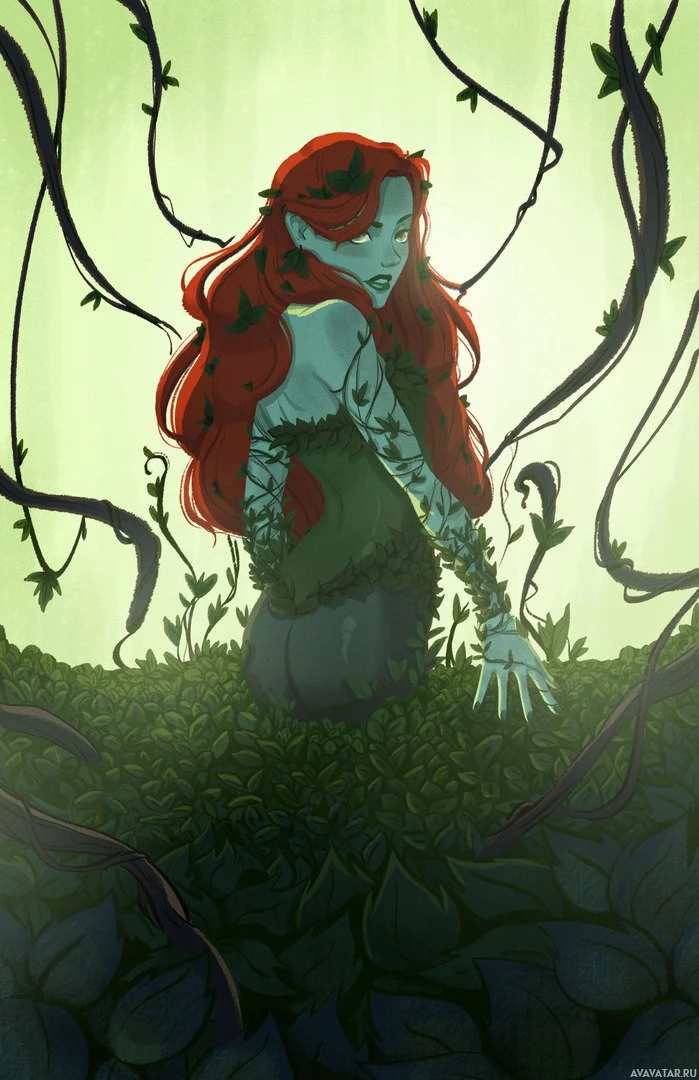 red hair, wearing a green dress and surrounded by vegetation that looks like poison ivy. She appears to be in