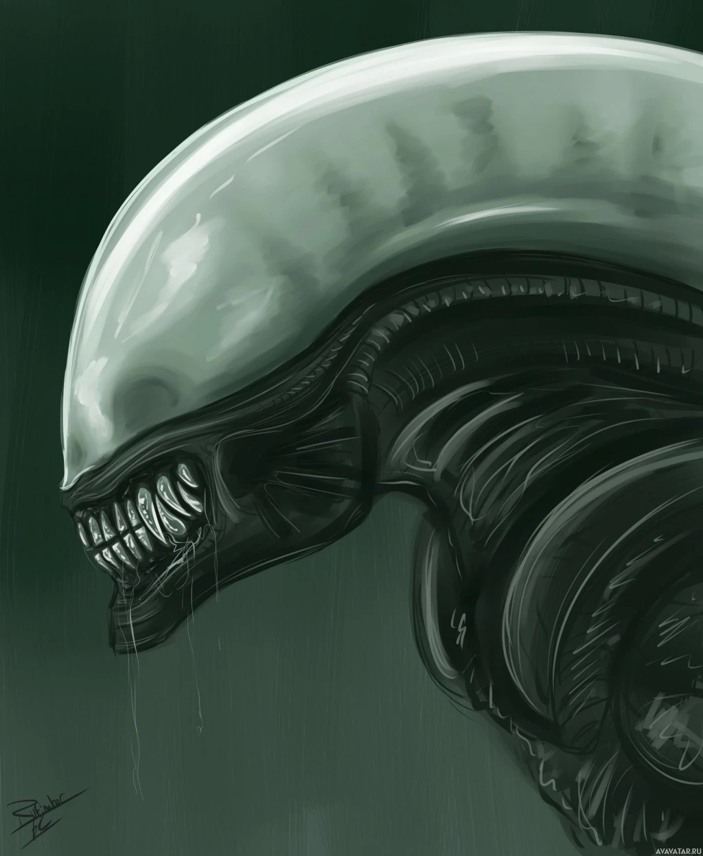 На картинке изображена иллюстрация персонажа из фильма «Чужие». На ней изображена голова и верхняя часть туловища существа, известного как Чужой, которое знаменито изображено актером Полом Рубенсом в серии фильмов.