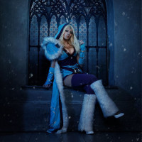 The image depicts a person cosplaying as the character Crystal Maiden from