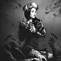 ominous atmosphere suggested by the background, which includes silhouettes of trees against a twilight sky. The woman seems to be looking directly at the viewer with