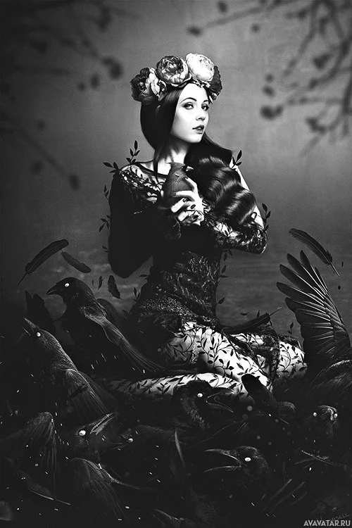 brown hair and is wearing a dress with intricate patterns. Around her are numerous