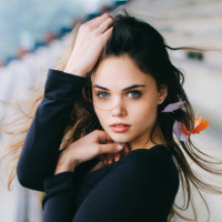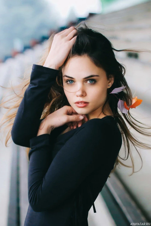 long hair, dressed in what appears to be a dark top. She is standing outdoors and seems to be touching or brushing her hair away from her face, possibly enjoying the breeze. There's a blurred background that suggests