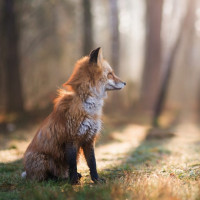 a red fox sitting in the sunlight on grass. The fox appears calm and is looking towards the camera, possibly observing something or someone with interest. The setting suggests it could be
