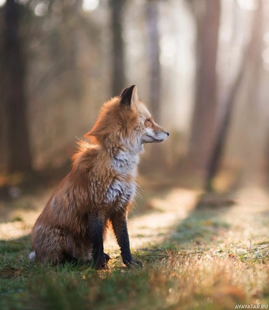 early morning or late afternoon, as indicated by the warm lighting and the shadows cast by the trees around the fox.