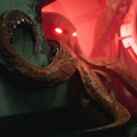 menacing expression and large, prominent eyes, situated in what looks like an underground or industrial setting, possibly a dungeon or basement. There are pipes and