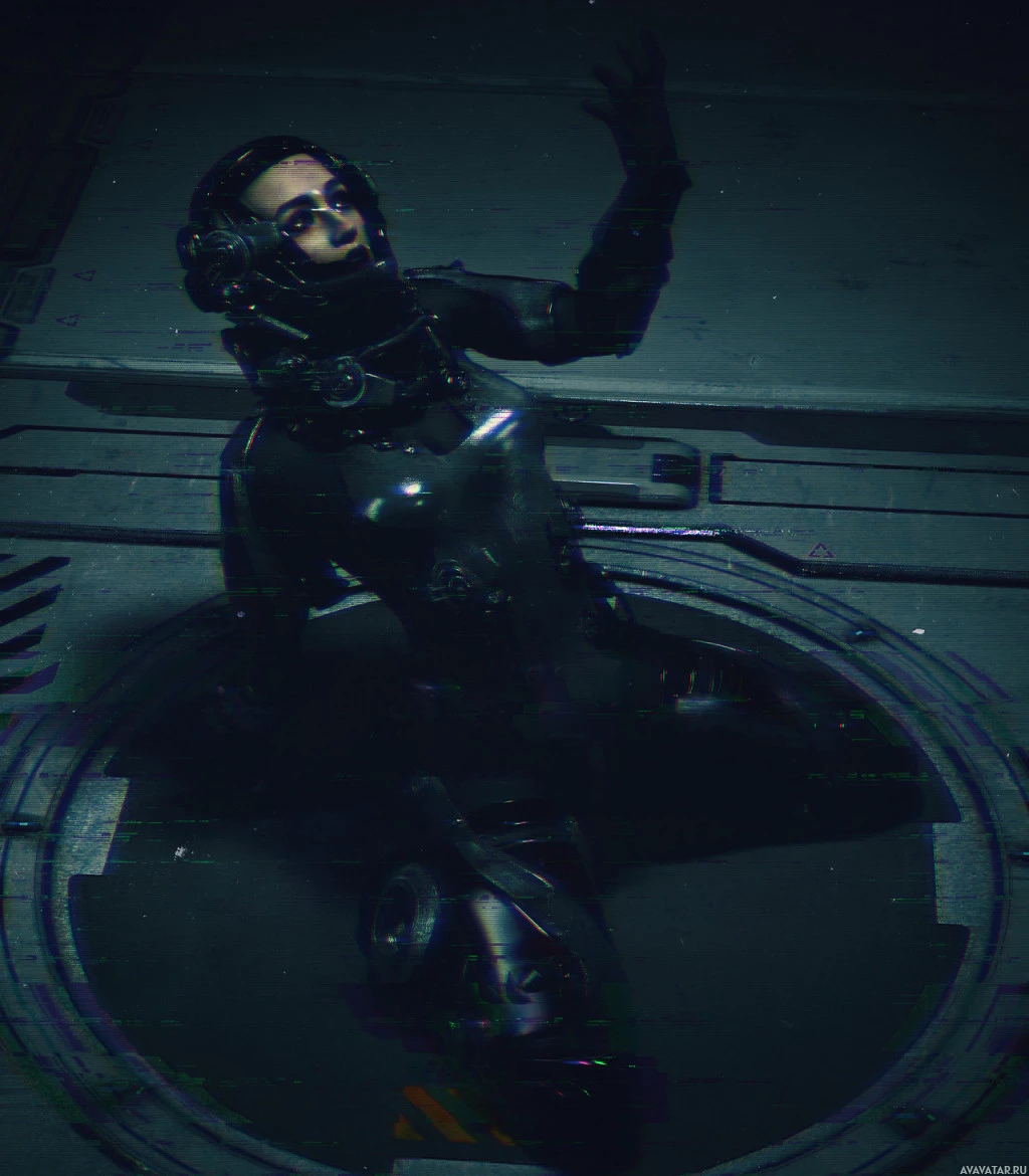 a circular platform with her arms outstretched, as if she were floating or being suspended in mid-air. The background has an industrial or technical look, which suggests the setting could be inside a spaceship or some form of