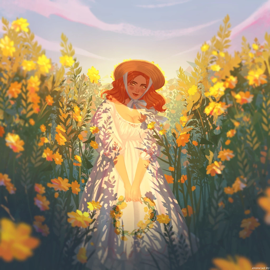 red hair, wearing a flowing white dress and a straw hat. She is surrounded by