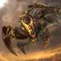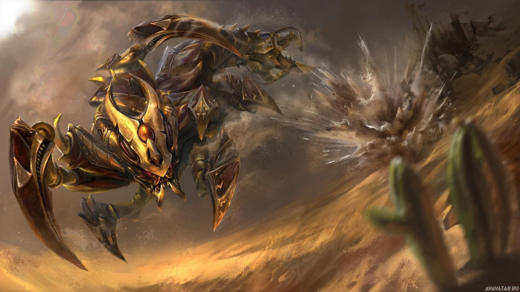 a robotic character with multiple arms and legs, reminiscent of the Sand King, who is known for his sand abilities in the game. This character appears to be attacking or defending an area, as indicated by the dust being kicked up around it, suggesting movement. The background shows what seems to be a desert-like environment, which aligns with the usual settings of