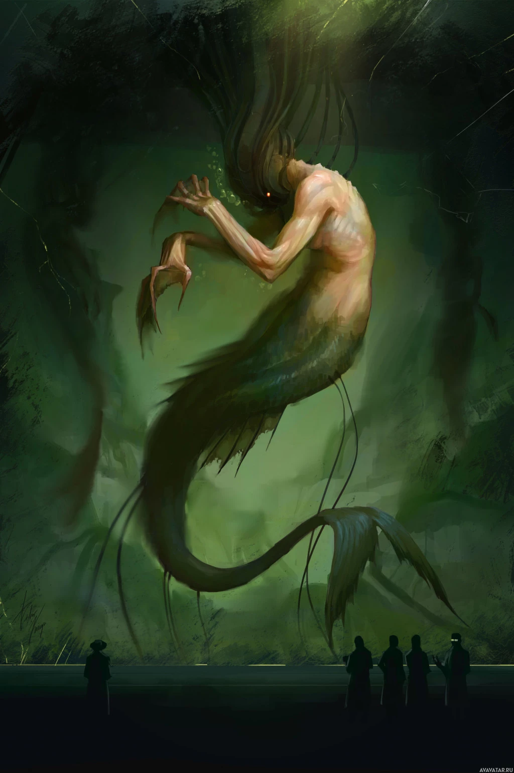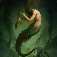 a fantastical scene where a humanoid mermaid is seen in the midst of a forest or jungle. The mermaid has a human-like upper body with arms and hands, but instead of legs, it has a tail that resembles that of a fish. It appears to be in
