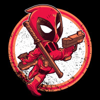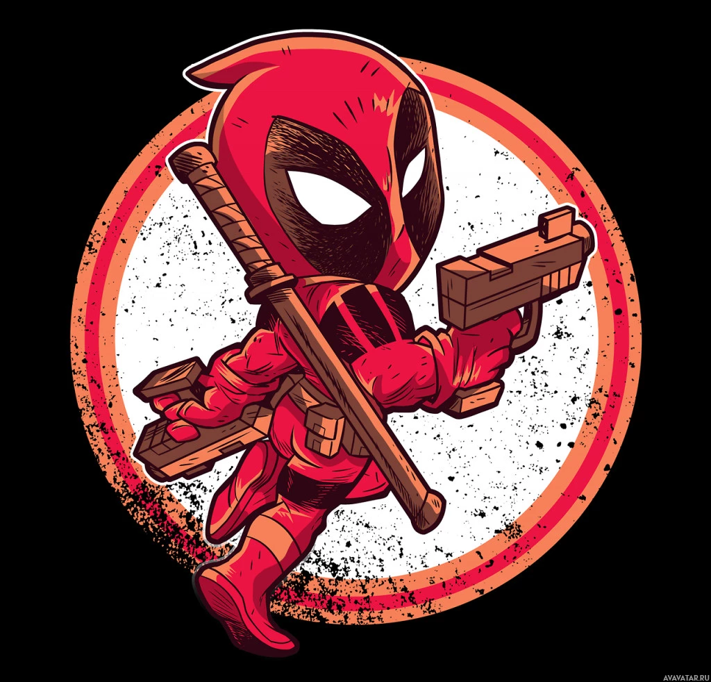 book character known for his humorous and often violent antics. In the depiction, Deadpool is shown running with what appears to be a gun in each hand. His costume is red and black, and he has