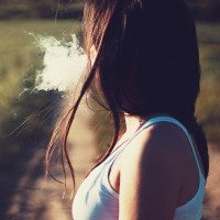 relaxed posture and the smoke rising from what looks like a cigarette or electronic device in her hand. The lighting suggests either late afternoon or early morning sunlight, which casts