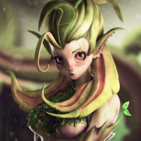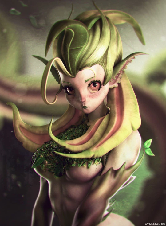 mythical being associated with forests and nature. She has green skin and features like leaves or foliage on her body, which are typical attributes of such characters in various mythologies and