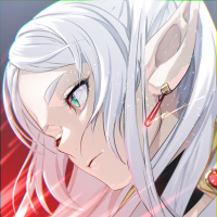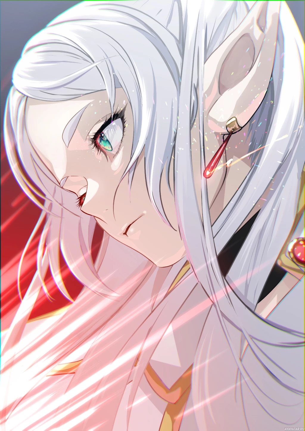 white hair and pointed ears, which is indicative of a fantasy or elf-like appearance. This character is drawn in the style commonly associated with Japanese animation, or anime. The artwork showcases