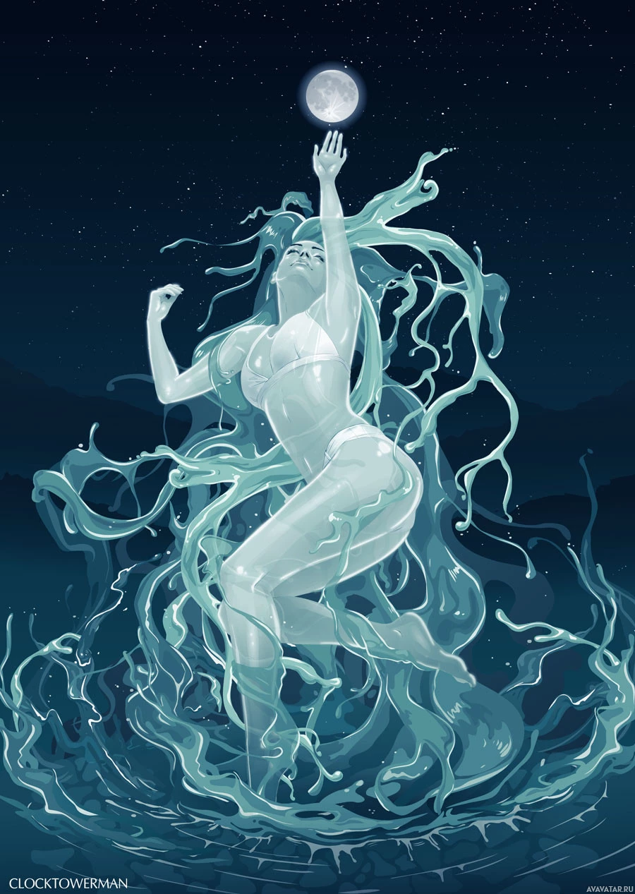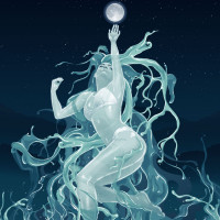 a mystical atmosphere. Her attire appears to be minimalistic or possibly related to water, such as mermaid-like or sea creature motifs. The overall composition is surreal, blending elements of fantasy with