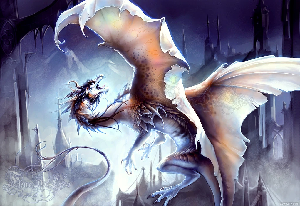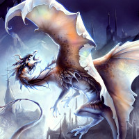 glowing light in the distance and what seems to be a floating or levitating object near the dragon's head. The overall impression is one of fantasy and