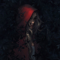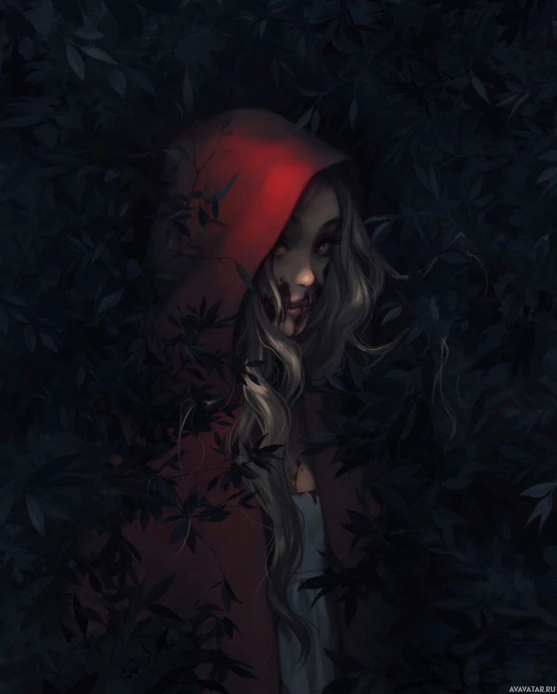 a nighttime setting. The cloak is red, providing a contrast against the greenery around her.