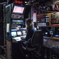 a control console. She appears to be operating the equipment, which includes various computer monitors and other