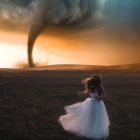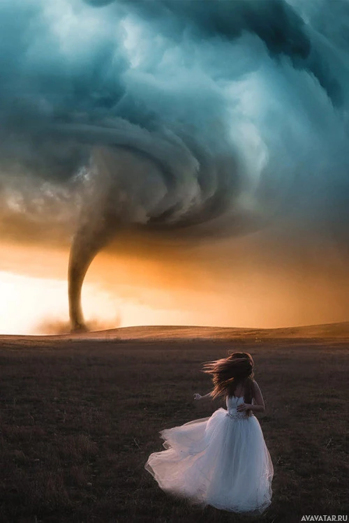 a dramatic scene of a tornado or cyclone with a dark cloud looming above. The sky transitions from